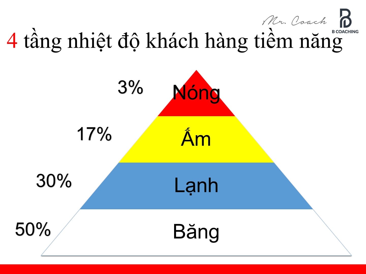 G giải thích “Ở bất kỳ 1 thời điểm nào, trong bất kỳ thị trường nào, khi anh tiếp cận phân khúc khách hàng tiềm năng thì có 4 nhóm người. Nhóm thứ nhất khoảng 3% đang có nhu cầu mua ngay là nhóm NÓNG. Nhóm này tích cực tìm kiếm sản phẩm, nhà cung cấp phù hợp. Nhóm thứ 2 là nhóm ẤM. Nhóm này biết mình có vấn đề cần giải quyết tuy nhiên họ chưa có nhu cầu mua ngay trong ngắn hạn. Nhóm này chiếm khoảng 17%. Nhóm thứ ba là LẠNH chiếm khoảng 30%. Nhóm này biết rằng sẽ có vấn đề nhưng không có nhu cầu. Nhóm thứ 4 là BĂNG chiếm 50%. Nhóm này hoàn toàn không quan tâm, bởi vì họ không có nhu cầu, không có vấn đề”